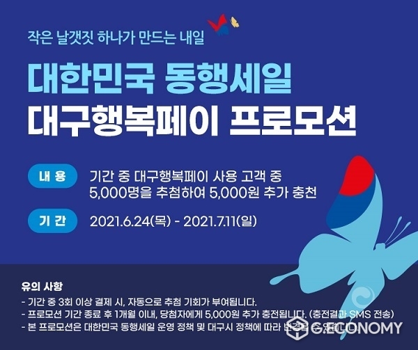 DGB대구은행은 카드형 지역사랑상품권 '대구행복페이'의 운영대행사로, 본 프로모션은 6월24일부터 오는 7월11일까지 실시되는 2021 행사 기간 동안 3회 이상 대구행복페이를 사용한 고객을 대상으로 한다. 별도 응모 절차 없이 해당 고객 모두 추첨 기회가 부여되며, 5천명을 추첨해 5천원을 추가 충전한다.