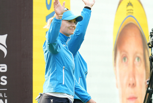 호주의 한나 그린이 20일 경기도 파주 서원힐스C.C.에서 열린 LPGA 투어 'BMW 레이디스 챔피언십' 마지막날 4라운드 경기 18번 홀에서 우승을 확정짓는 퍼트를 성공시킨 후 동료들로부터 와인 세례를 받고 있다. 사진 제공: BMW 코리아
